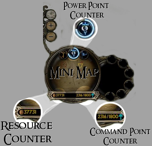 Command points (often abbreviated to CP) are the game mechanics that regulate the amount of heroes and units you can have. In skirmish mode (and other modes that don't affect the command points), you start with 500 and must increase that limit through pantry upgrades that can be bought on at the citadel or at the Sanctuary in the case of Lothlorien. CPs are located at the bottom right of your mini-map palantir. However, the maximum amount the CP limit can be increased to is 1500; beyond that, purchasing the pantry upgrade will not increase your CP limit. Because of the way that the CPs work (each unit costing a couple CPs instead of entire battalions) it is possible to exceed this limit. Simply lose enough units without losing the battalion and keep training battalions, then simply heal or buy banner carriers and your battalions will regenerate.